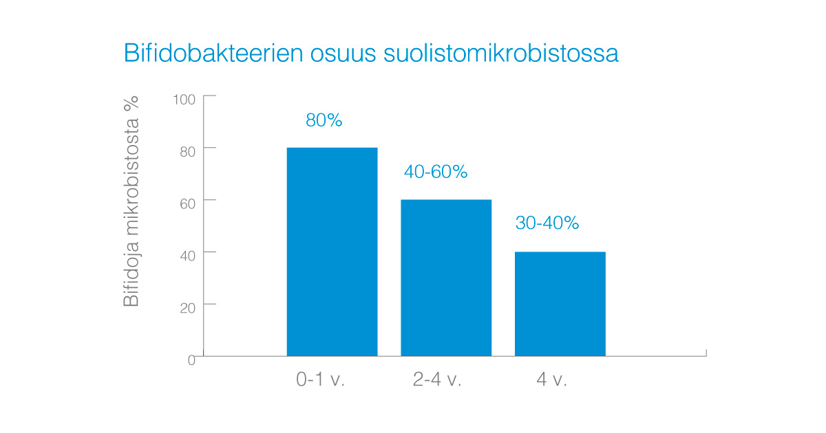 Heti syntymän jälkeen suun limakalvoille asettuvat Streptococcus salivarius -maitohappobakteerit. Ne muodostavat ensimmäisen luonnollisen suojamuurin taudinaiheuttajia vastaan. Nämä bakteerit estävät haitallisten mikrobien kiinnittymistä ja aktivoivat paikallista vastustuskykyä. Vauvaikäisen suolistossa tärkeimpiä bakteereita ovat bifidobakteerit. Rintaruokituilla vauvoilla bifidobakteerit voivat muodostaa jopa yli 80 prosenttia koko suoliston mikrobistosta. Kun lapsen ruokavalio monipuolistuu, myös bakteerilajien valikoima vähitellen laajenee ja bifidobakteerien osuus laskee. Lapsilla bifidobakteerien osuus on kuitenkin aina suuri ja tärkeä.