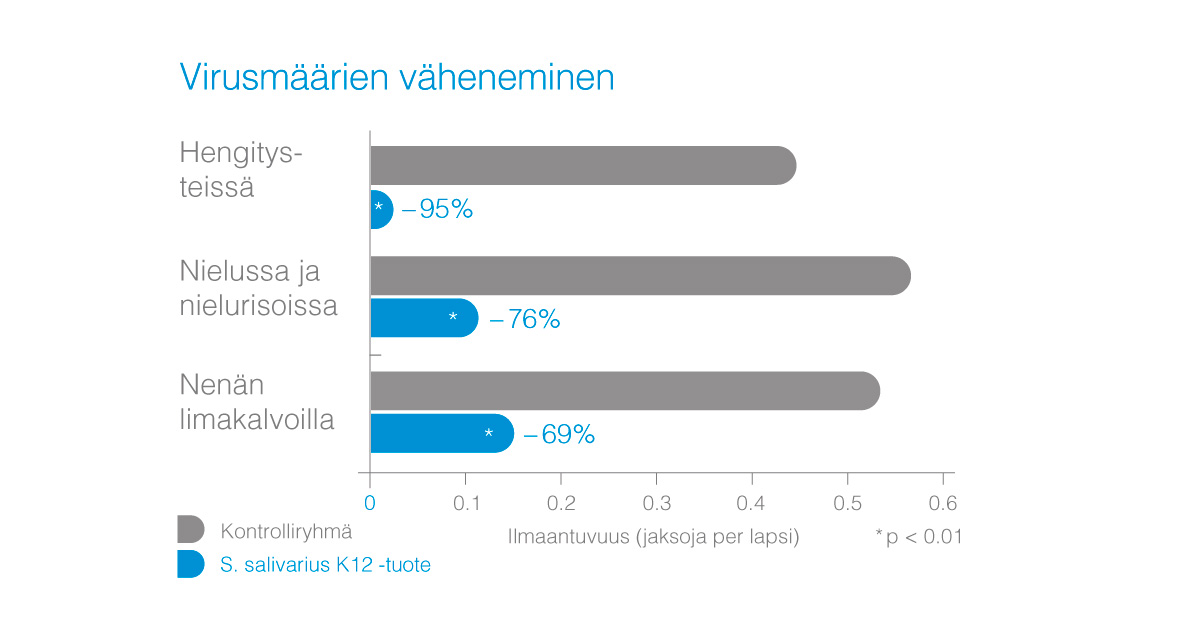 Suu toimii koko kehon ensimmäisenä suojamuurina. Maitohampaiden puhjetessa suuhun ilmaantuvat myös plakkia ja kariesta aiheuttavatStreptococcus mutans -bakteerit. Tutkimuksissa on havaittu, että tietyt suun ja nielun alueelle kuuluvat hyödylliset bakteerit ehkäisevät ei-toivottujen bakteerien lisääntymistä. Erityisesti Streptococcus salivarius -kannoilla M18 ja K12 on todettu useita suun ja nielun terveyttä tukevia ominaisuuksia. Nämä S. salivarius -kannat on alun perin eristetty terveen lapsen suusta. Ne tuottavat antimikrobisia yhdisteitä, neutraloivat happohyökkäyksiä, hajottavat plakkia ja estävät värjäytymistä aiheuttavien bakteerien kasvua. Lisäksi ne aktivoivat suun ja nielun paikallista puolustusjärjestelmää.