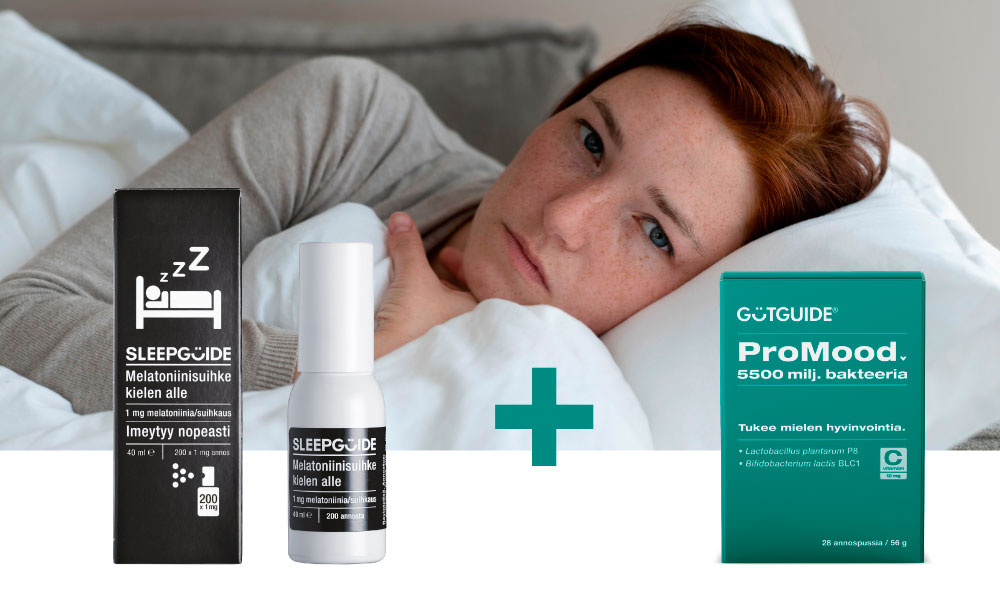 Kun nopeavaikutteinen SleepGuide-melatoniinisuihkeen yhdistetään suolistoa tasapainottavan ProMood-bakteerilisän tai Promood-suklaan kanssa, keho saa parhaat mahdolliset eväät stressin selättämiseksi ja laadukkaaseen yöunen palauttamiseksi. Tärkeää on myös huomoida ruokavalion koostumus tryptofaani aminohappojen suhteen, tumma suklaa on tähän hyvä lisä.