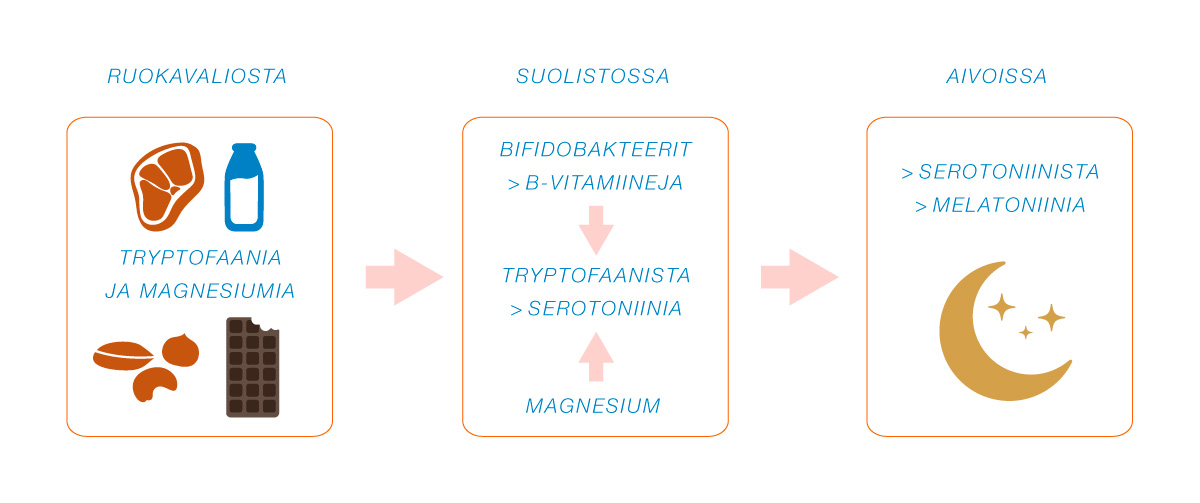 Tryptofaani ruoasta (esim. lihasta, maidosta) muuttuu suolistossa serotoniiniksi magnesiumin (mm. tummasta suklaasta) ja bifidobakteerien tuottama B-vitamiinin avulla. Aivoissa seratoniini muuttuu unihormoni melatoniiniksi.