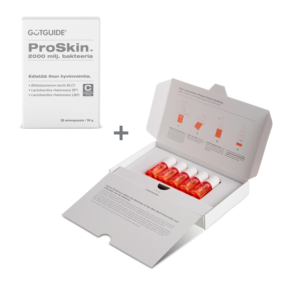 GutGuide® ProSkin on kolmen bakteerikannan, Bifidobacterium longum 7347, Bifidobacterium lactis 8145 ja Lactobacillus rhamnosus 8361 yhdistelmätuote herkälle iholle suoliston kautta. Pakkaus sisältää 28 annospussia. Yhteensä 56 grammaa.